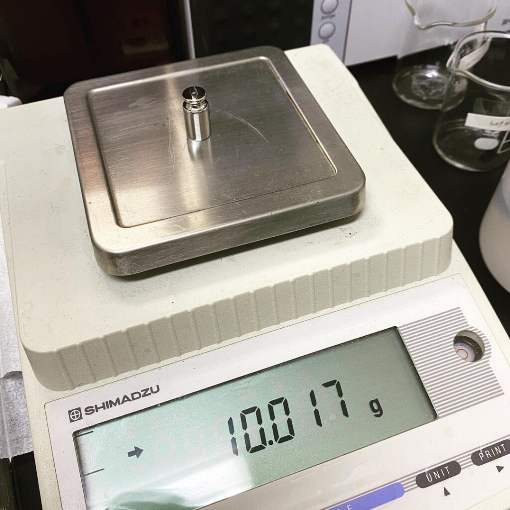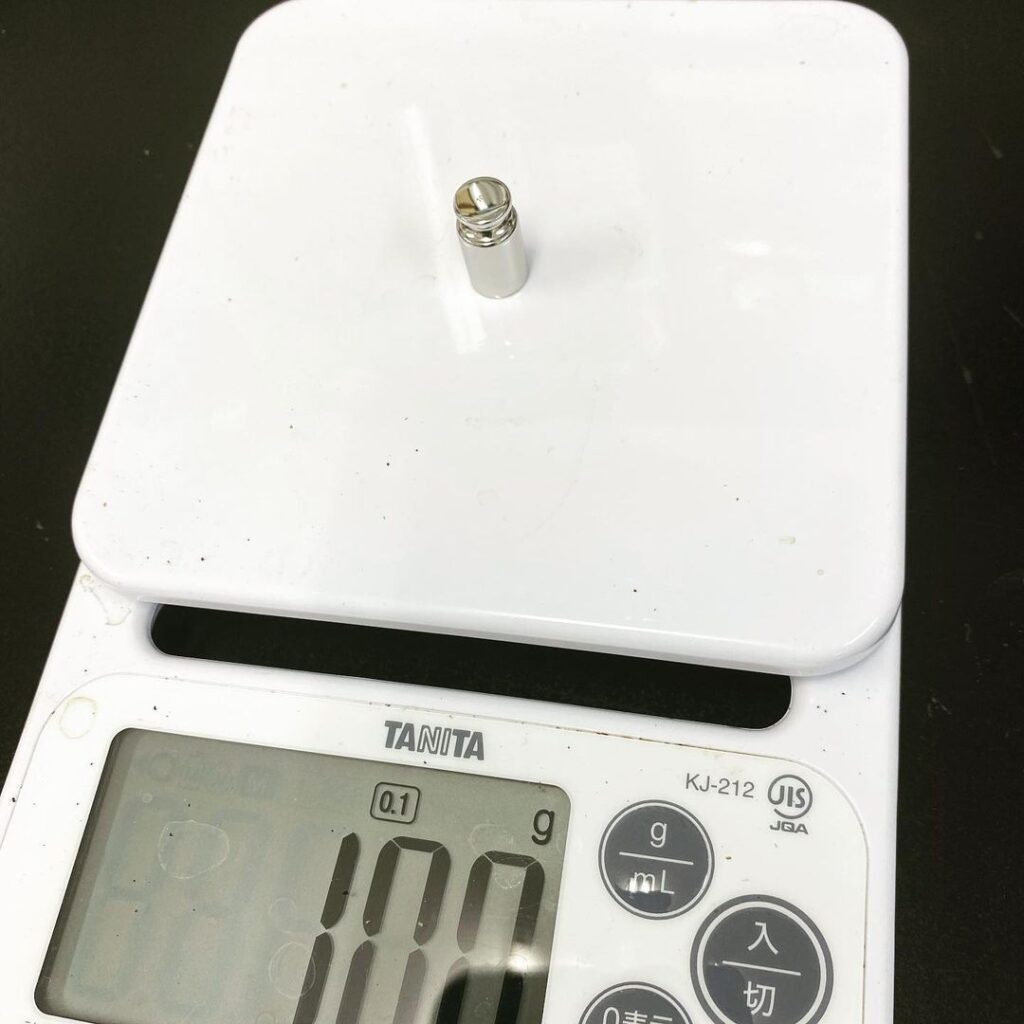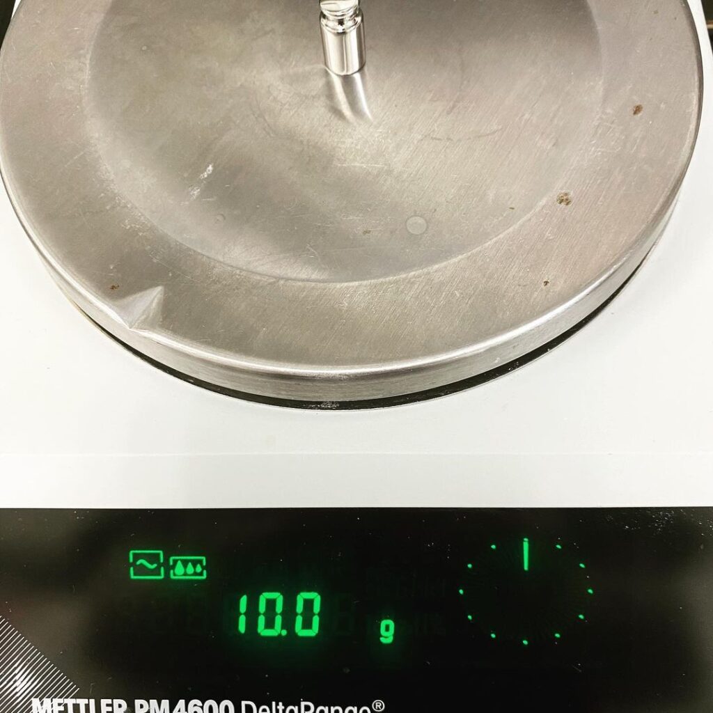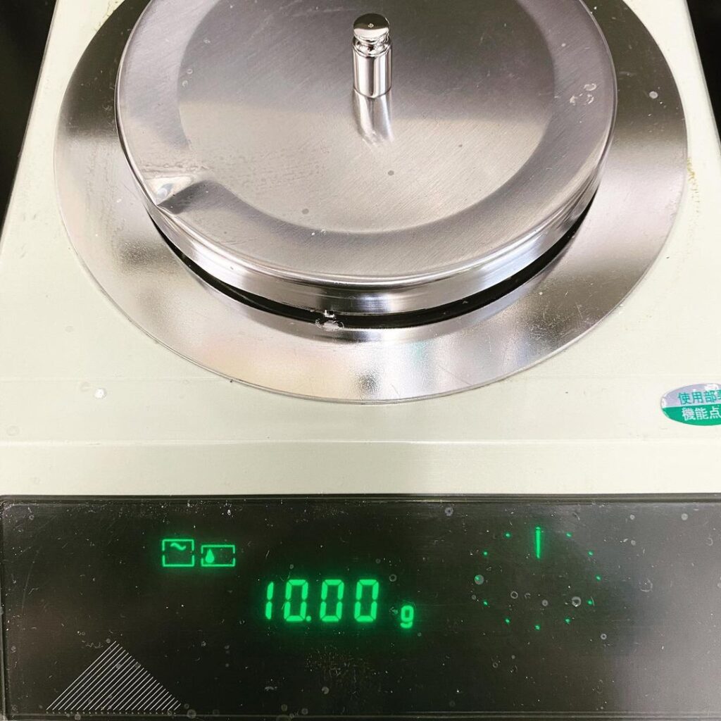 F2クラスの10 g分銅ですので、±0.6mgの誤差しかありません。ので、この分銅は9.9994 g〜10.0006 gの間の重さと言う事になります。ウチにある秤いくつかで測っても、大体は10.00 g迄の表示でしたが、最も高額の薬剤調合用の秤はさすが、10.017 gと出ました。0.4mgの誤差は有ると言う事ですね。コーヒーの粉の重さなら問題有りませんが、ミリオーダーの実験には不可欠な精度なのです。